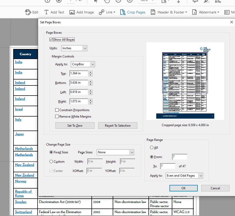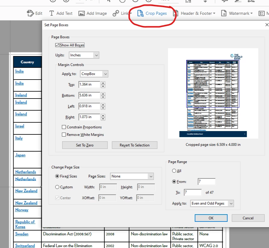 The latest is annoyance is cropping pages. I've always been able to select the section of the page I wanted to keep and crop much as you would in Photoshop. Following the Adobe instructions, I am never able to draw a frame of the area to be cropped. The cursor turns into an arrow, but it doesn't respond. All I get is a "Set Page Boxes" dialog.