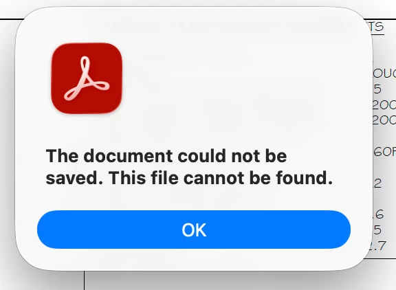 Now, after re-installing Acrobat, I’m receiving the same error: The document could not be saved. This file cannot be found.