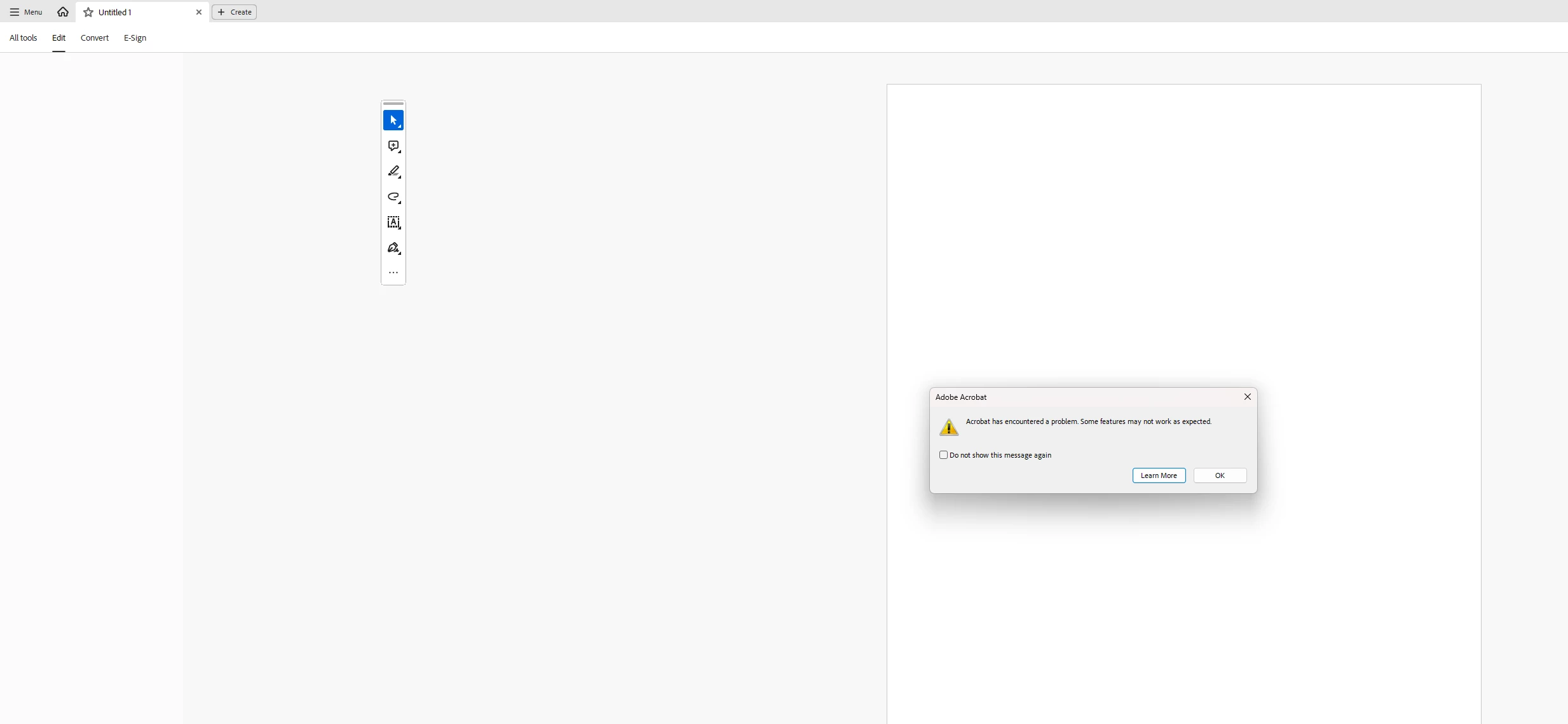 No matter what I do, once I open or create any pdf and click edit I get this pop up. It removes the edit toolbar.