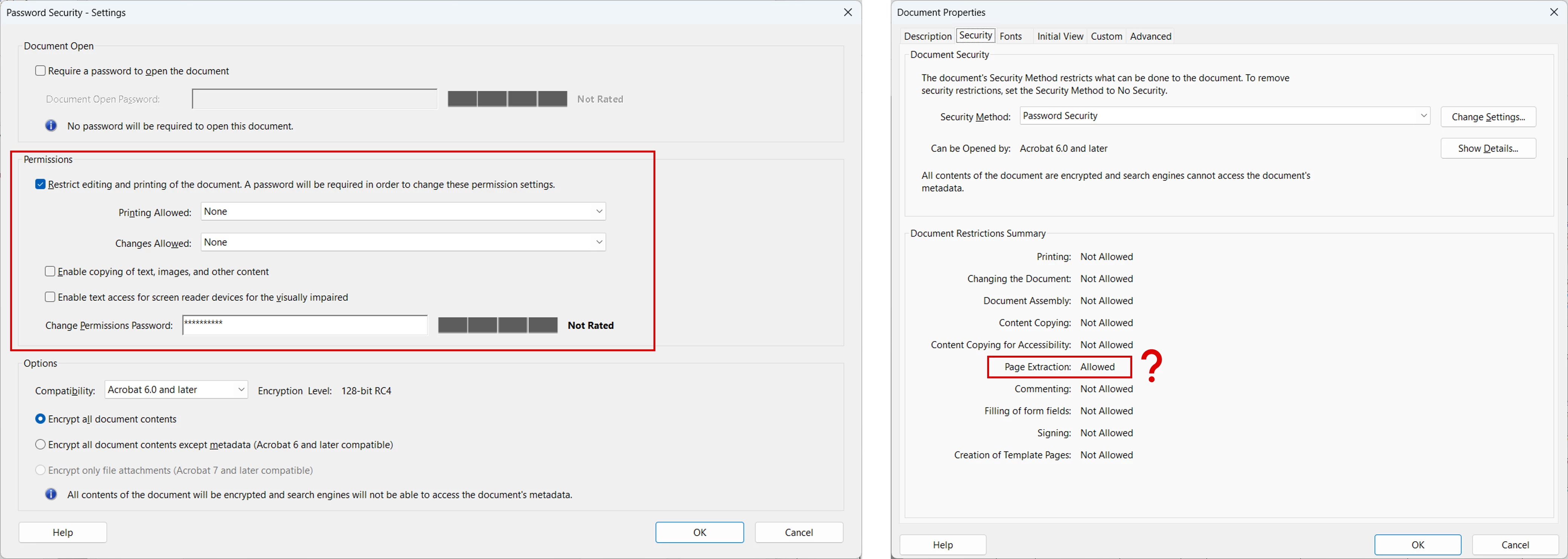 After saving and viewing the Document Restrictions Security, everything is "Not Allowed" except for Page Extraction. Isn't that also supposed to be "Not Allowed"? Is there something else I'm supposed to check?