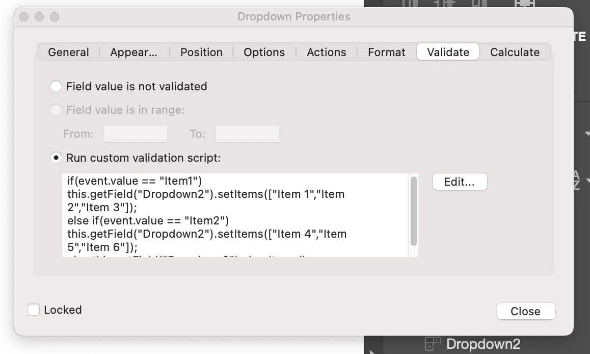 else this.getField("Dropdown2").clearItems();However, when I try to input this code in the "Run custom validation script" box, the code simply disappears when i click OK after editing.. How can I solve this?