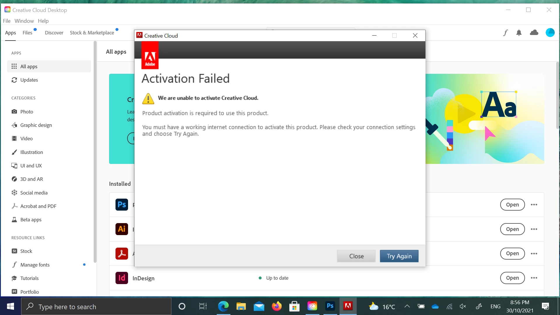 Internet working, i can open illustrator,photoshop, all updated. my laptop- window 10, 64bit