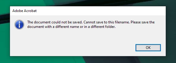 "The document could not be save. Cannot save to this filename. Please save the documetn with a different name or in a differnt folder."