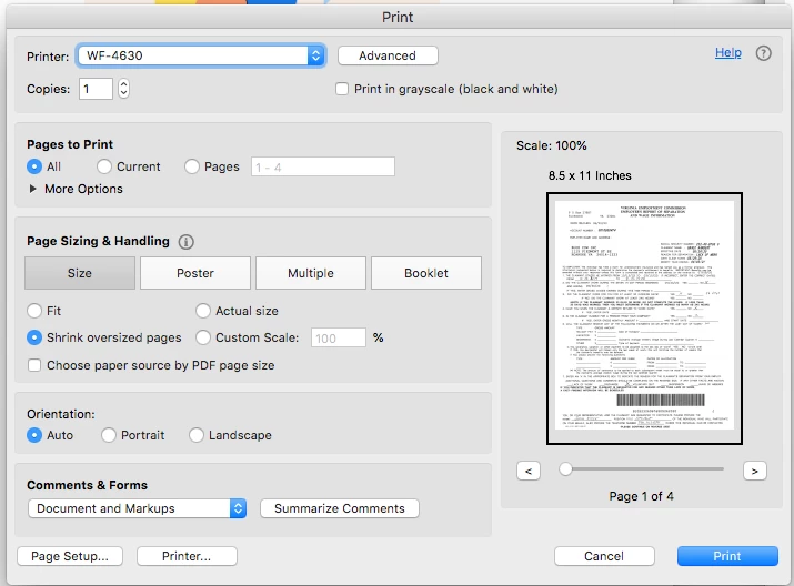 Just installed new Epson WF-4630. Confirmed Acrobat has latest updates. Print window does not show an option for two-sided printing. Screen shot of print window below.