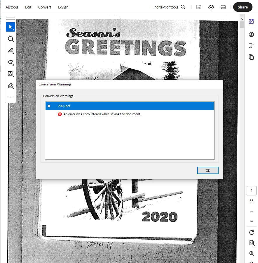 I have been trying to reduce files. No matter which option I choose, I get the attached message. I have tried rebooting my computer, signing in and out of Adobe, running the troubleshooting, etc. and no matter what I am unable to save the reduced file. Please help!
