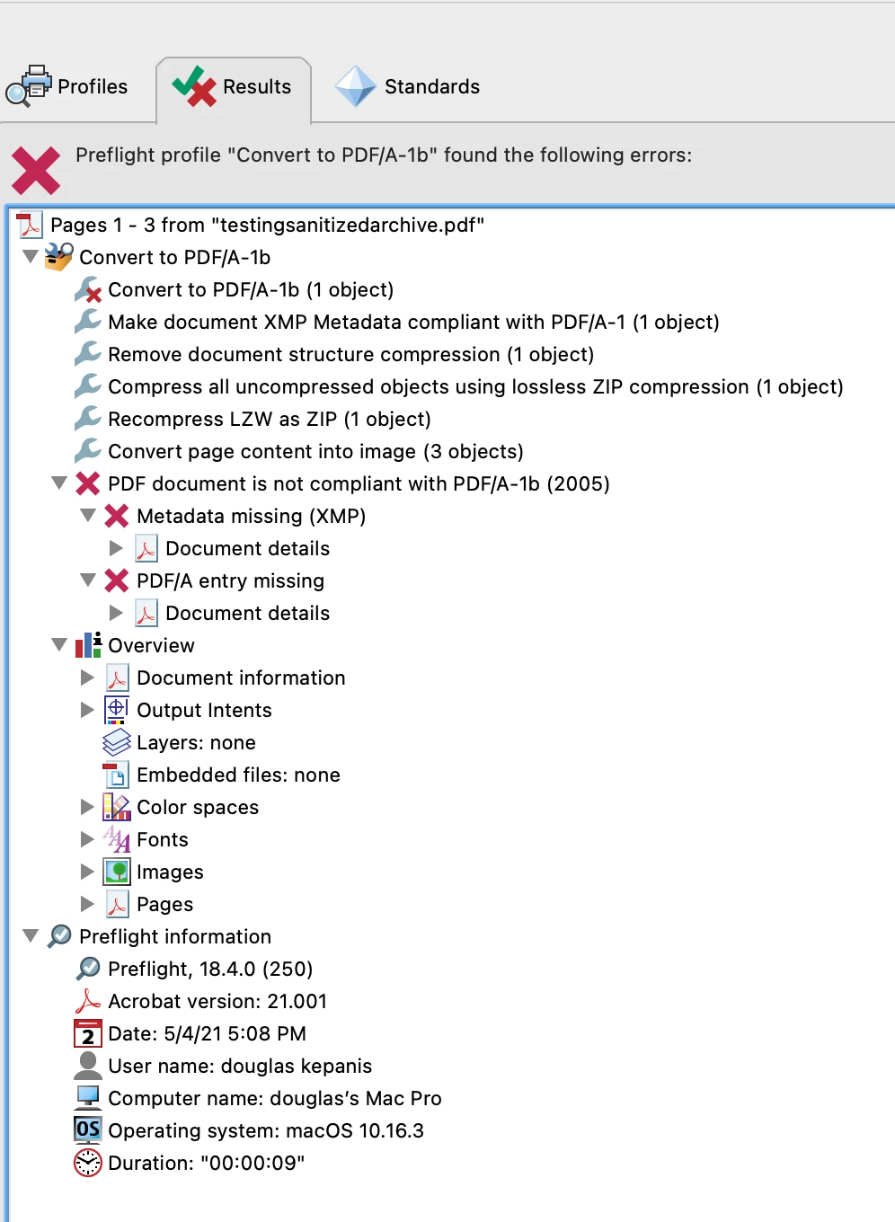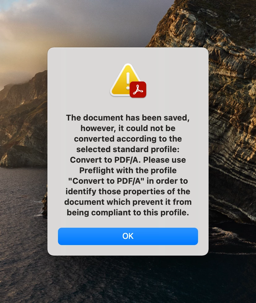 Whenever I sanitize a document and attempt to save it as a PDF/A, I get an error stating that I cannot do so