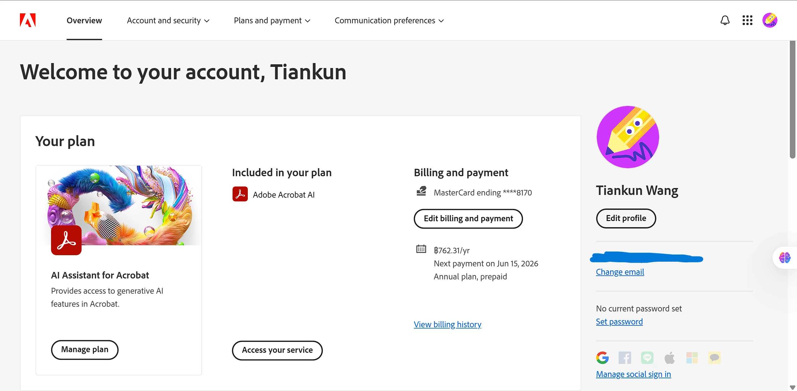 (BTW, I do not know why when I use alternative account of Google Chrome show the page of My account as Fig 5, but when I use the same email as Adobe one, it will show as Fig.4, cannot find any information about my AI Assistant description information)