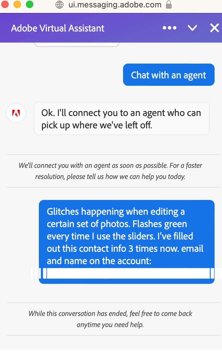 I can't find any other info about this glitch or anywhere to email adobe directly.