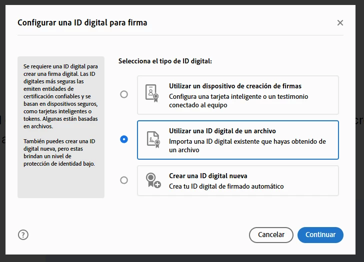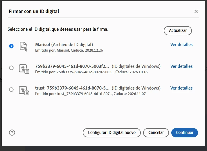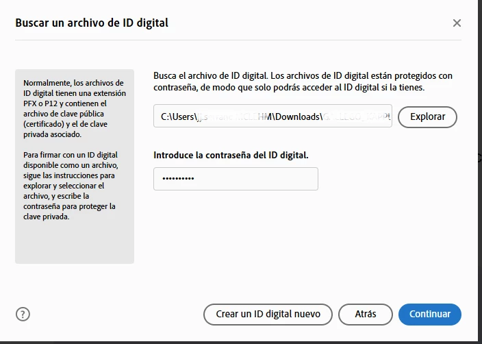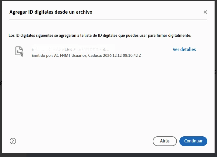 I'm trying to sign a PDF with an official certificate from the FNMT (the official certificate issuer in Spain). I can import it into Windows 10, validate it, and use it to sign in other applications without any problems, but when I try to sign it in Adobe Acrobat Pro, the option to use a certificate doesn't appear.