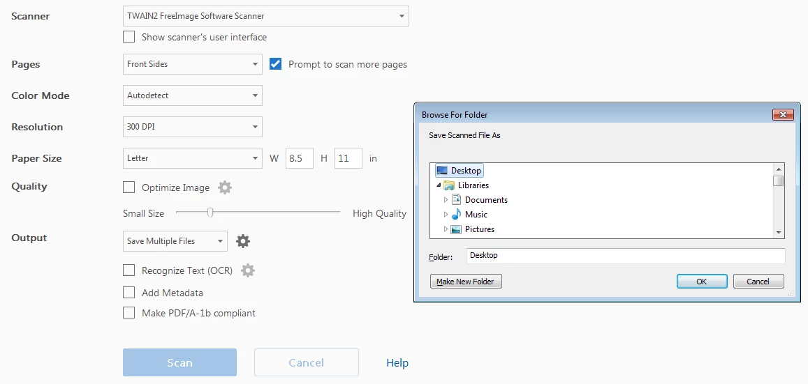 Whenever you set the output as "Save as multiple files" and click scan, it will ask you for a destination folder.