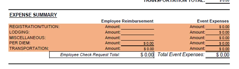 Employee Check Request Total totals everything under Employee Reimbursement. Total Event Expense Totals the calculated amounts under Event Expenses plus the amount Employee Check Request Total. I do not mind if it adds from the category totals.