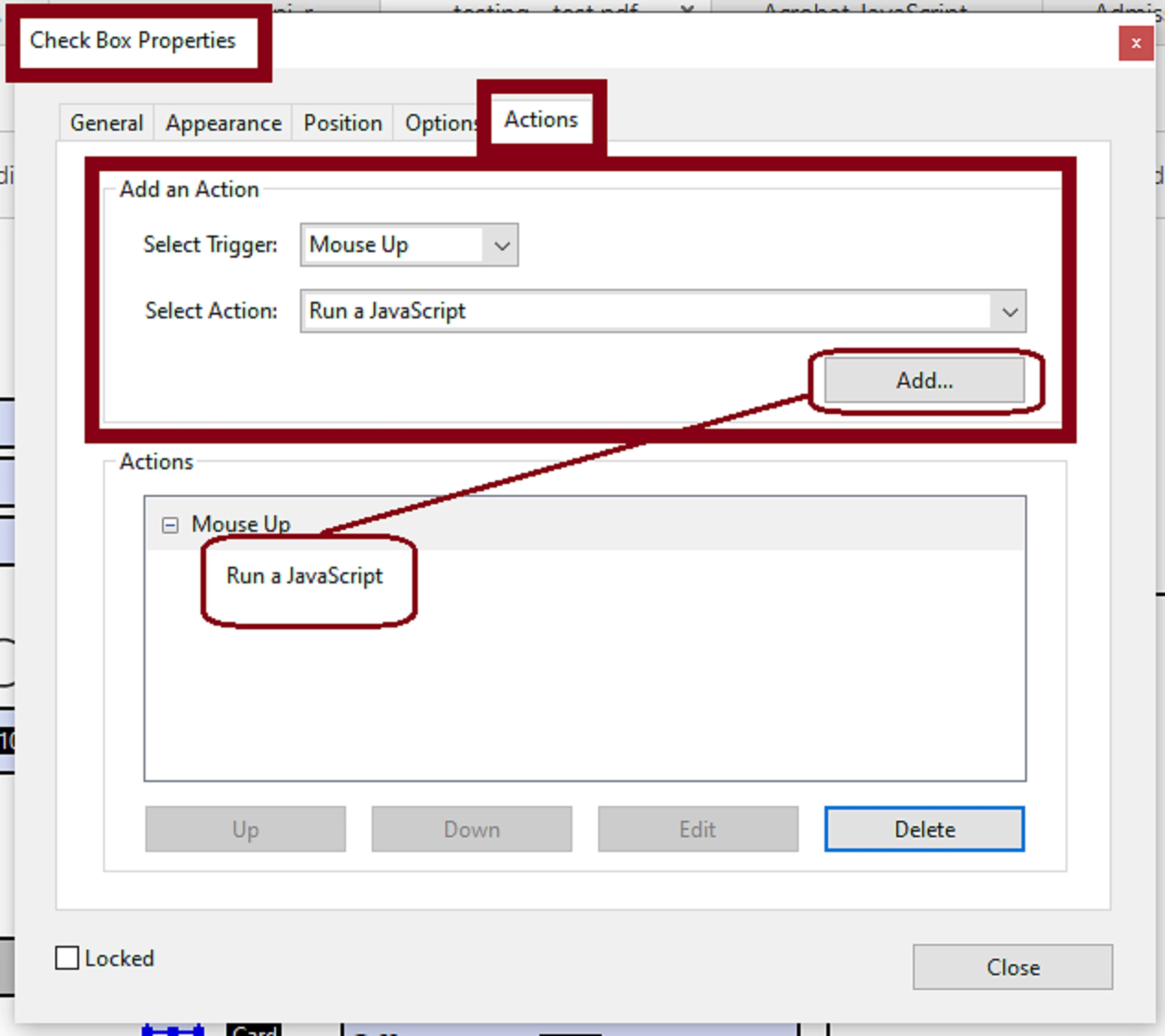 This will open the Checkbox Properties dialogue box where you will then click on the "Actions" tab.