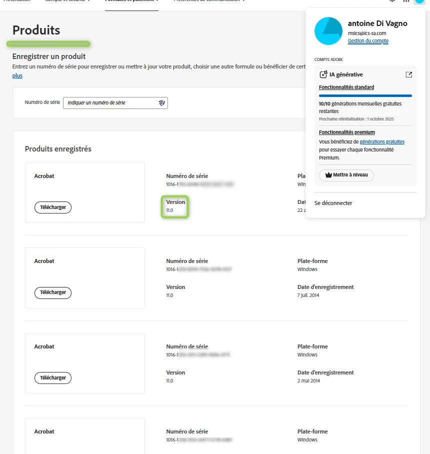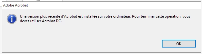 A l'utilisation des fonctionnalités de Acrobat XI , un message indique que Acrobat DC est plus récent.