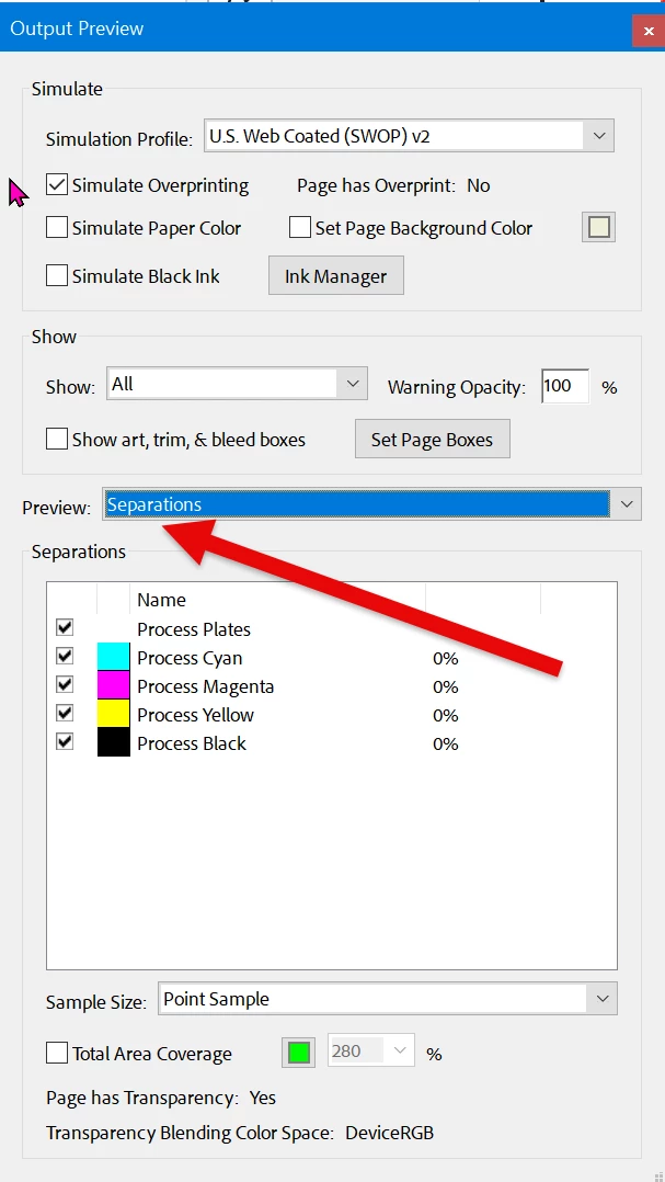 The Output Preview should default to Preview: Separations.