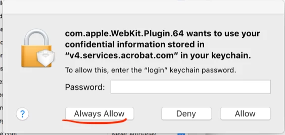 Apology for the trouble you have been facing. We are getting this keychain popup due to some architectural changes in Safari. To fix this I would request you to enter your password and click on  'Always Allow' (Don't hit Enter).  This will allow 'com.apple.Webkit.Plugin.64.xpc’ to get added to the list of 'Allowed applications' for 'v4.services.acrobat.com'.