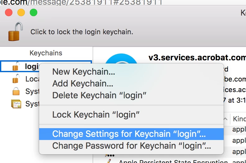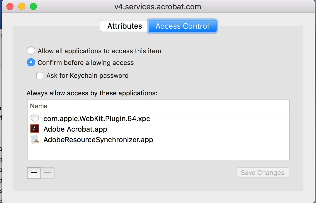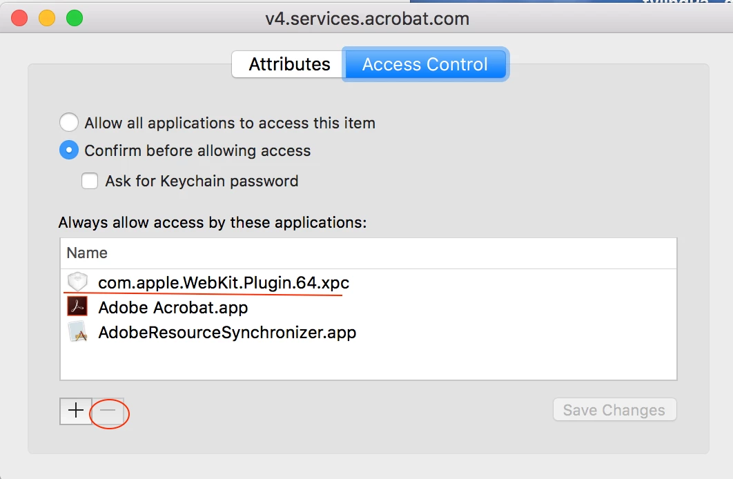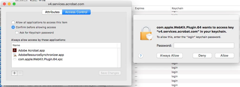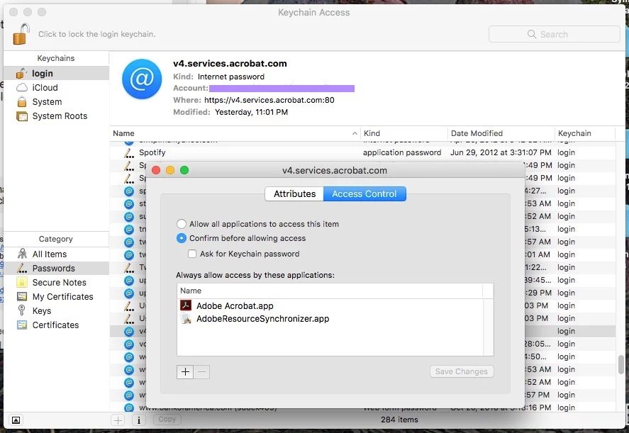 1. open 'Keychain Access' > select 'login' from left side pane > search for 'v4.services.acrobat.com' from the corresponding list > double click it > select 'Access control'.