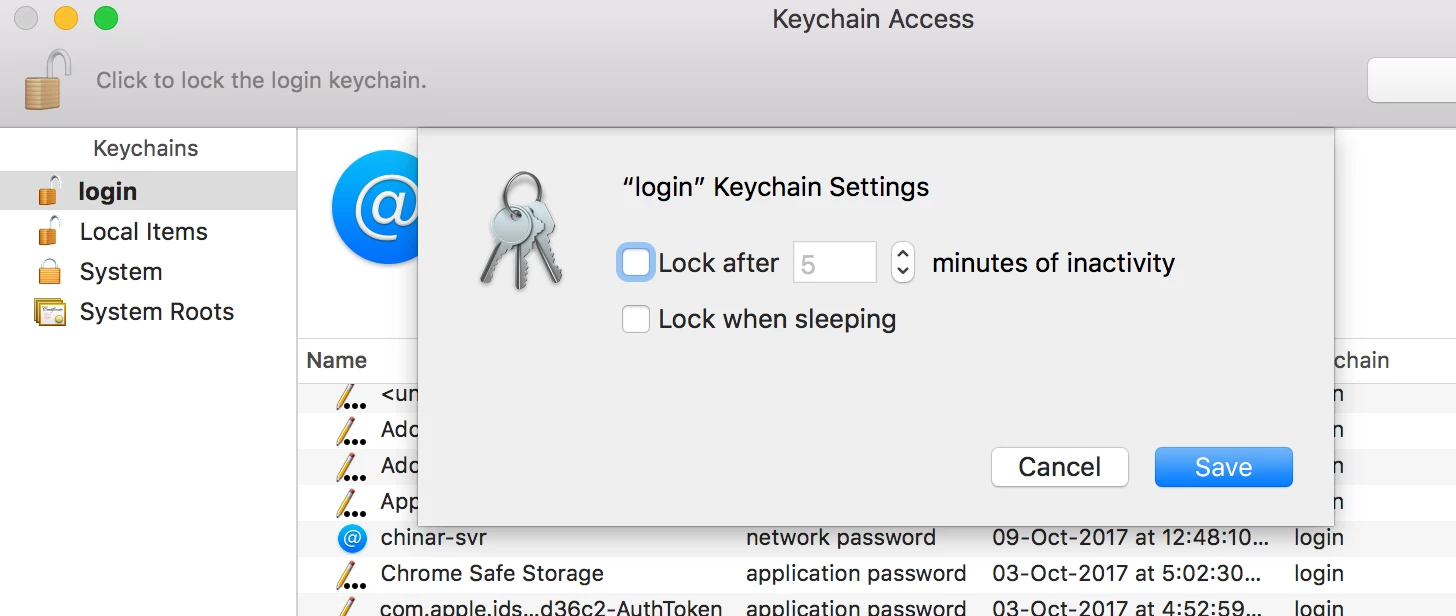 1. Open keychain. Right click on 'Login' from left hand pane and select 'change settings for keychain login'. Make sure both the options are unchecked as shown in the images below.