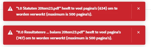 2/ And I encounter problem to turn 17 PDF documents into 1 single document of 1.800 pages: also error screen that maximum can be up to 1.500 pages.