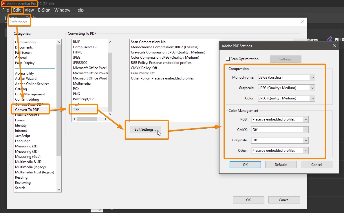 I am combining multiple TIFF files created in Photoshop into a single PDF file and when I do the pages come out striped with the first section of the image. I have tried doing a single TIFF to PDF and the same thing happens.