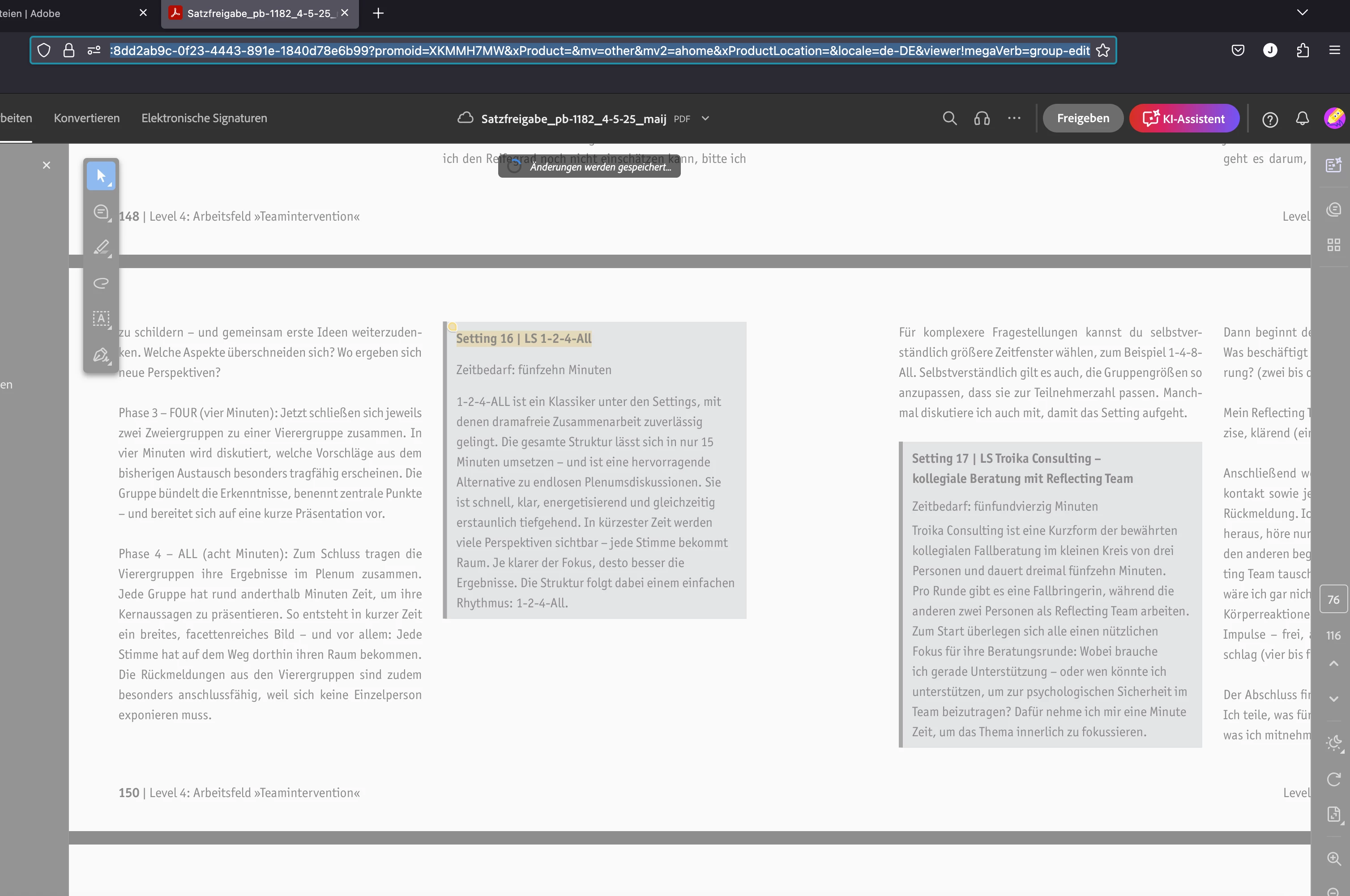 Ich arbeite an einem grossen PDF-Dokument (120 Seiten) mit der Acrobat Adobe Pro Version online.