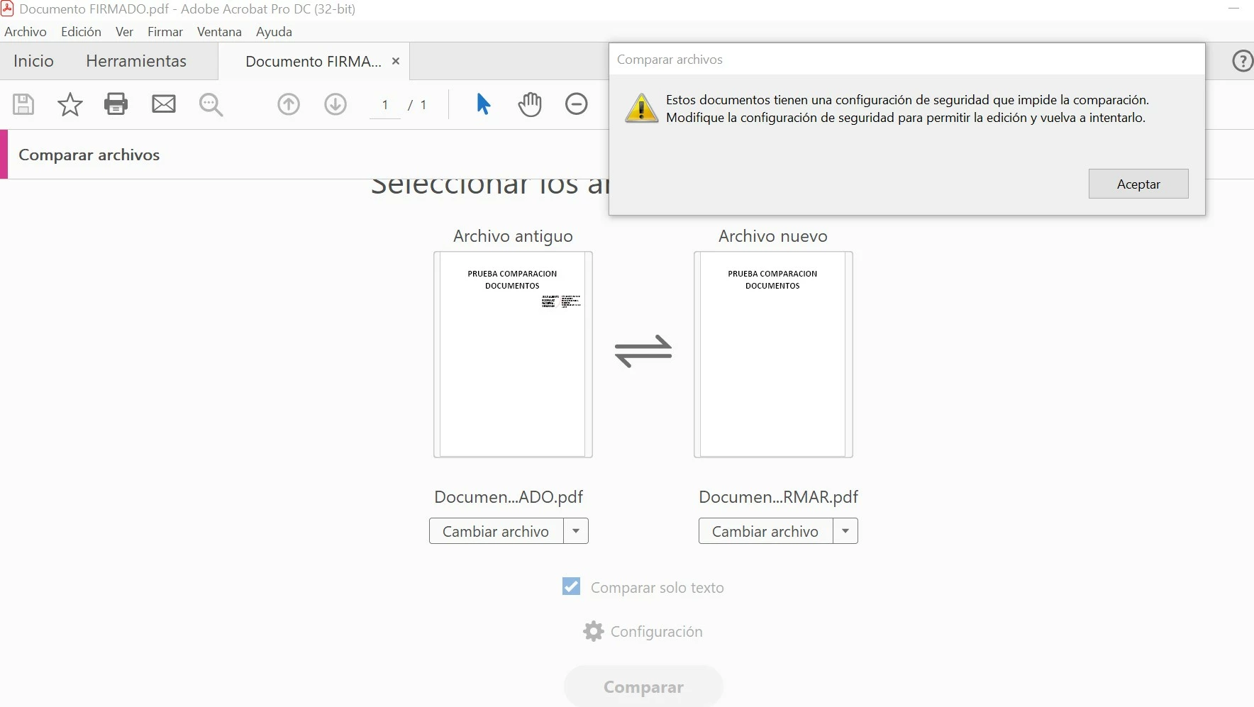 Selecciono los dos pdf a comparar (Ver, Comparar Archivos, Solo Texto) y si ninguno de los ficheros está firmado digitalmente, los compara sin problema, pero en el caso de que uno de ellos esté firmado, me da el mensaje "Los documentos tienen un configuración de seguridad que impide la comparación. Modifique la configuración de seguridad para permitir la edición y vuelva a intentarlo",
