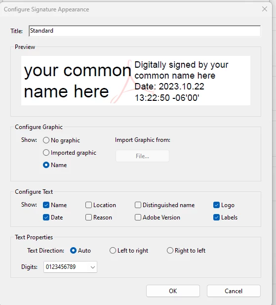 I'm probably doing something wrong, but I cannot figure out what it is. I created a new "Appearance" under Edit > Preferences > Signatures > Creation & Appearance > More... > Appearances > New, which I titled "Standard":