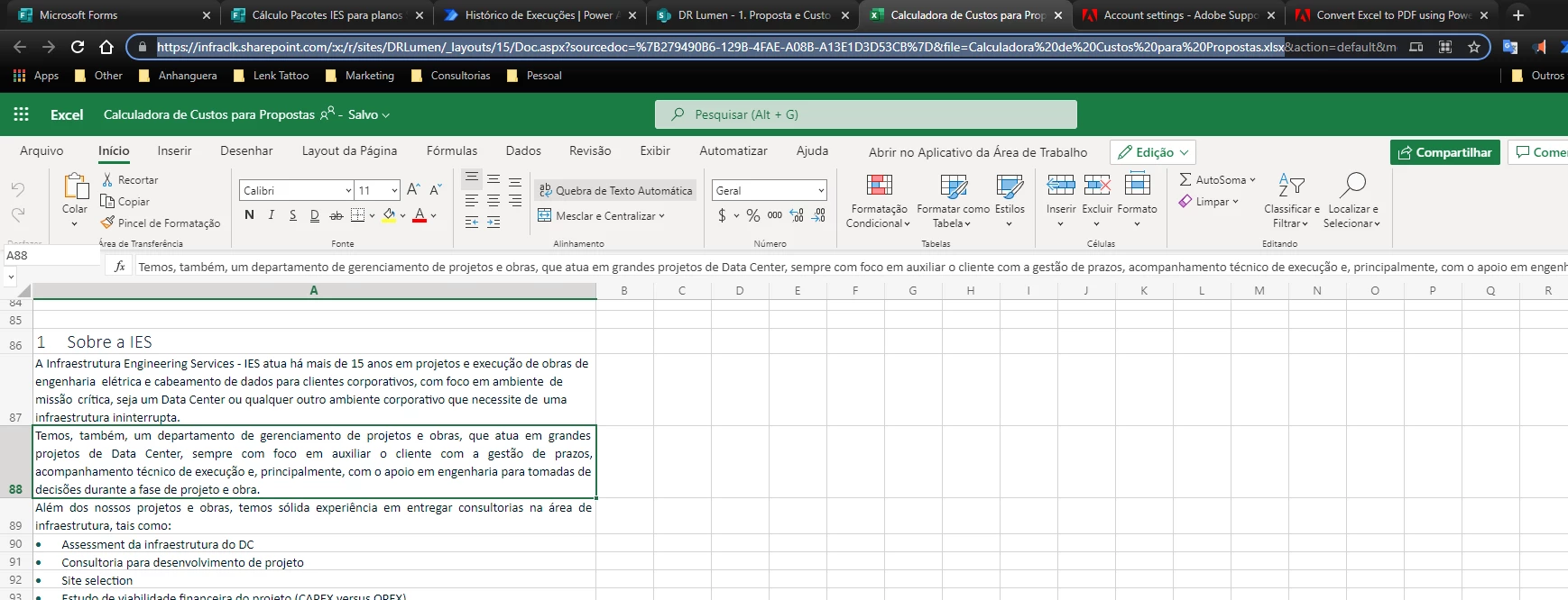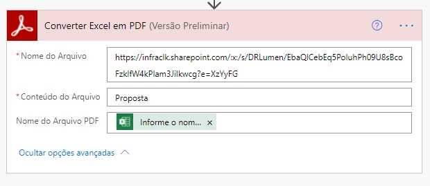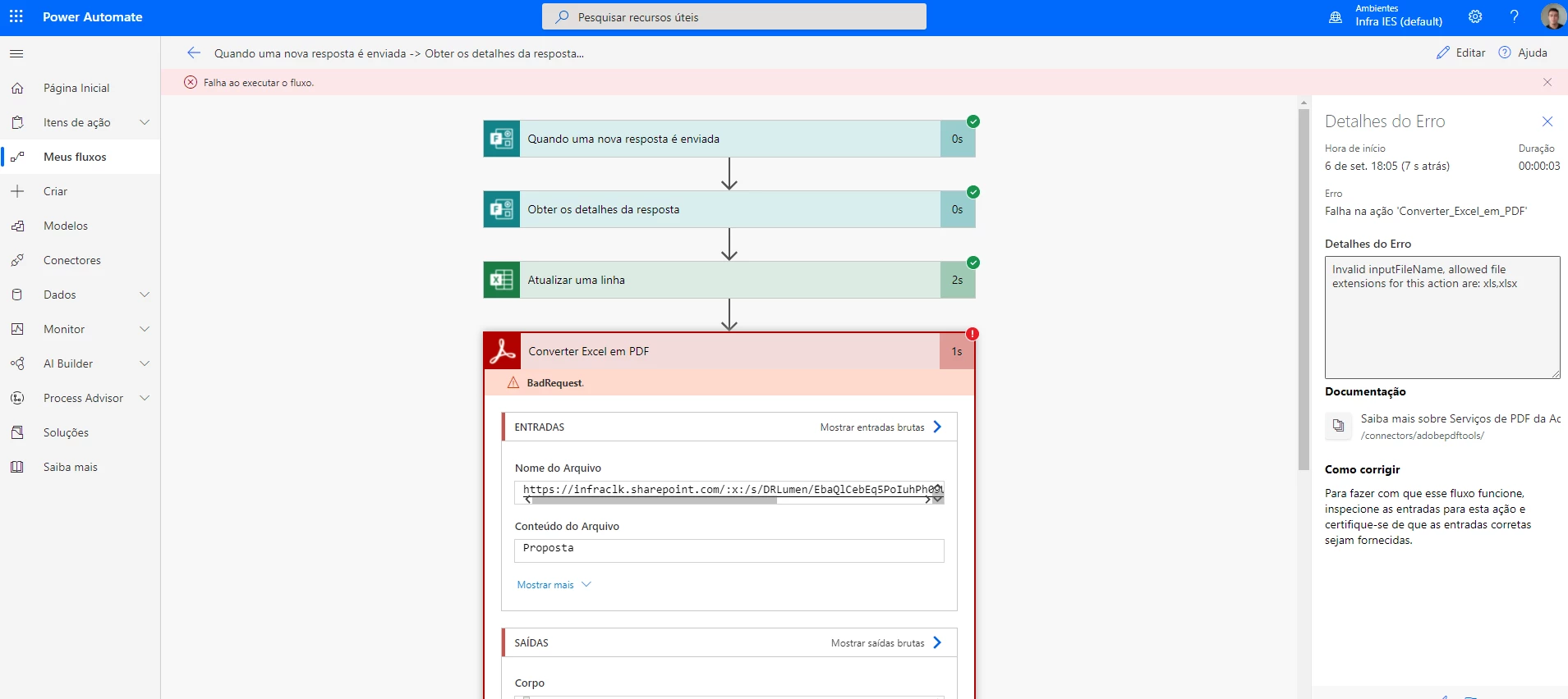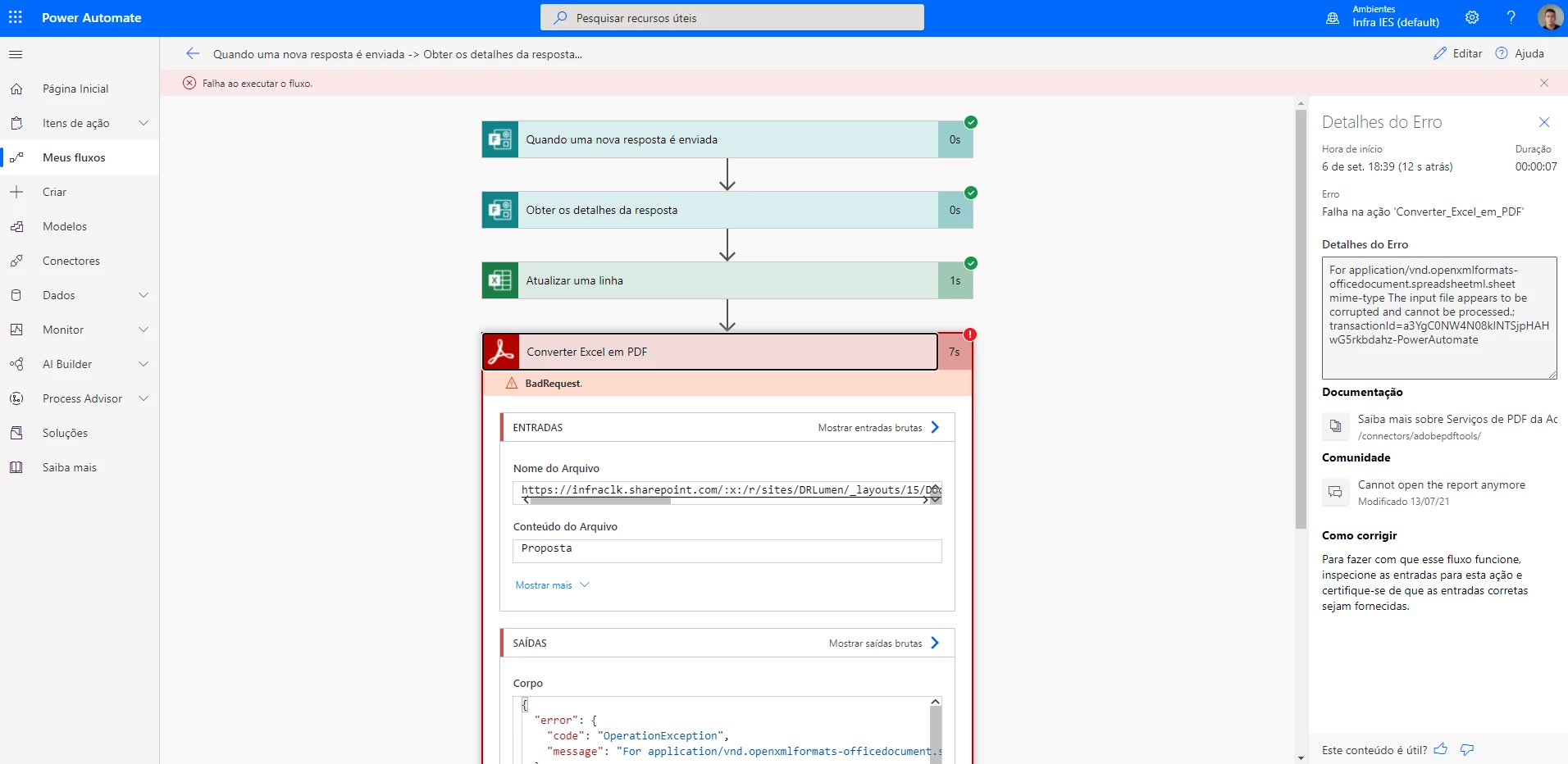 I am facing an issue when trying to use the Acrobat service to convert an Excel file located in OneDrive to a PDF.