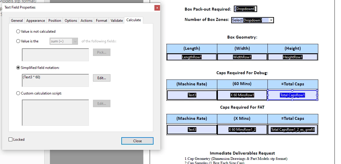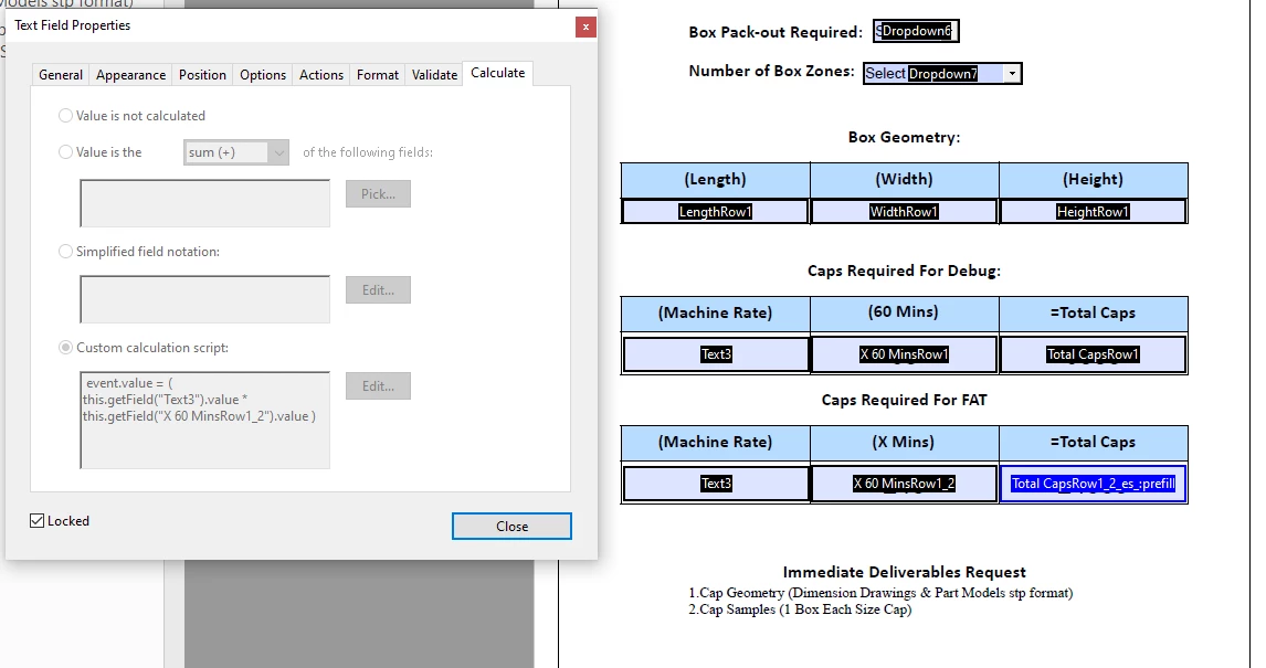 Any solution to this problem. Also i used the prepare tool on the pdf i created in framemaker>i then adjusted the values and in its finalized form the total cap boxes are leting the user fill in data when the data in those boxes should be automatically inputted when they fill out the machine rate boxes.