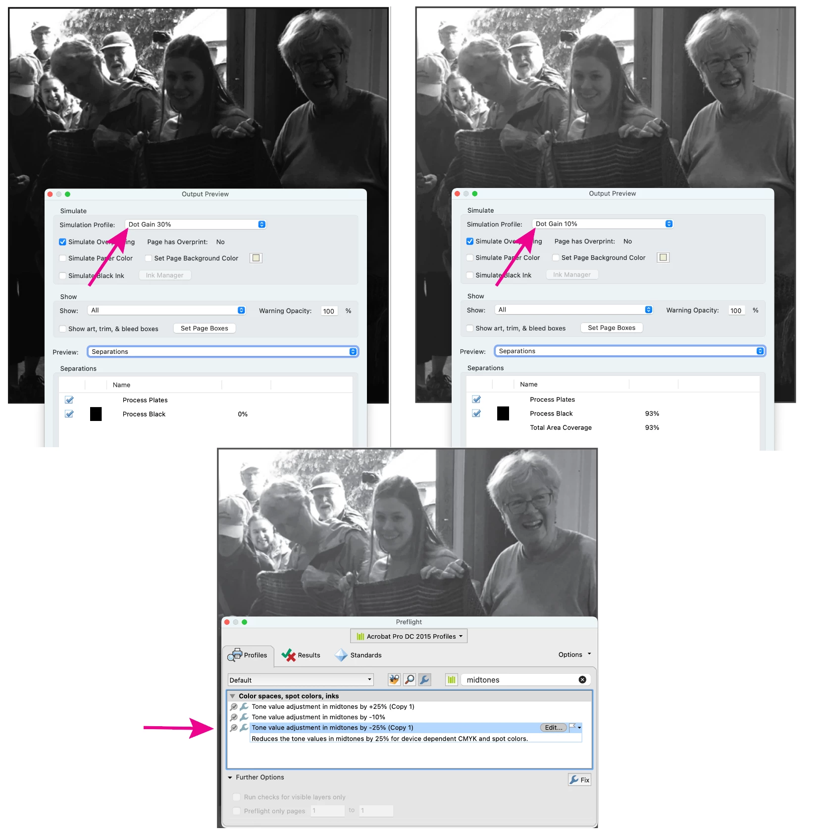 We have certain items with grayscale photos that use CMYK ink that we need to convert to black ink only. However when I use Convert to Grayscale or Digital Printing (B/W) to achieve this, the photos become extremely dark, unless I turn on Output Preview, at which point they appear brighter. The dark appearance happens whether I’m viewing them in Acrobat or a web browser. Why is this happening, and how can I prevent it? It has caused confusion when proofing to clients.