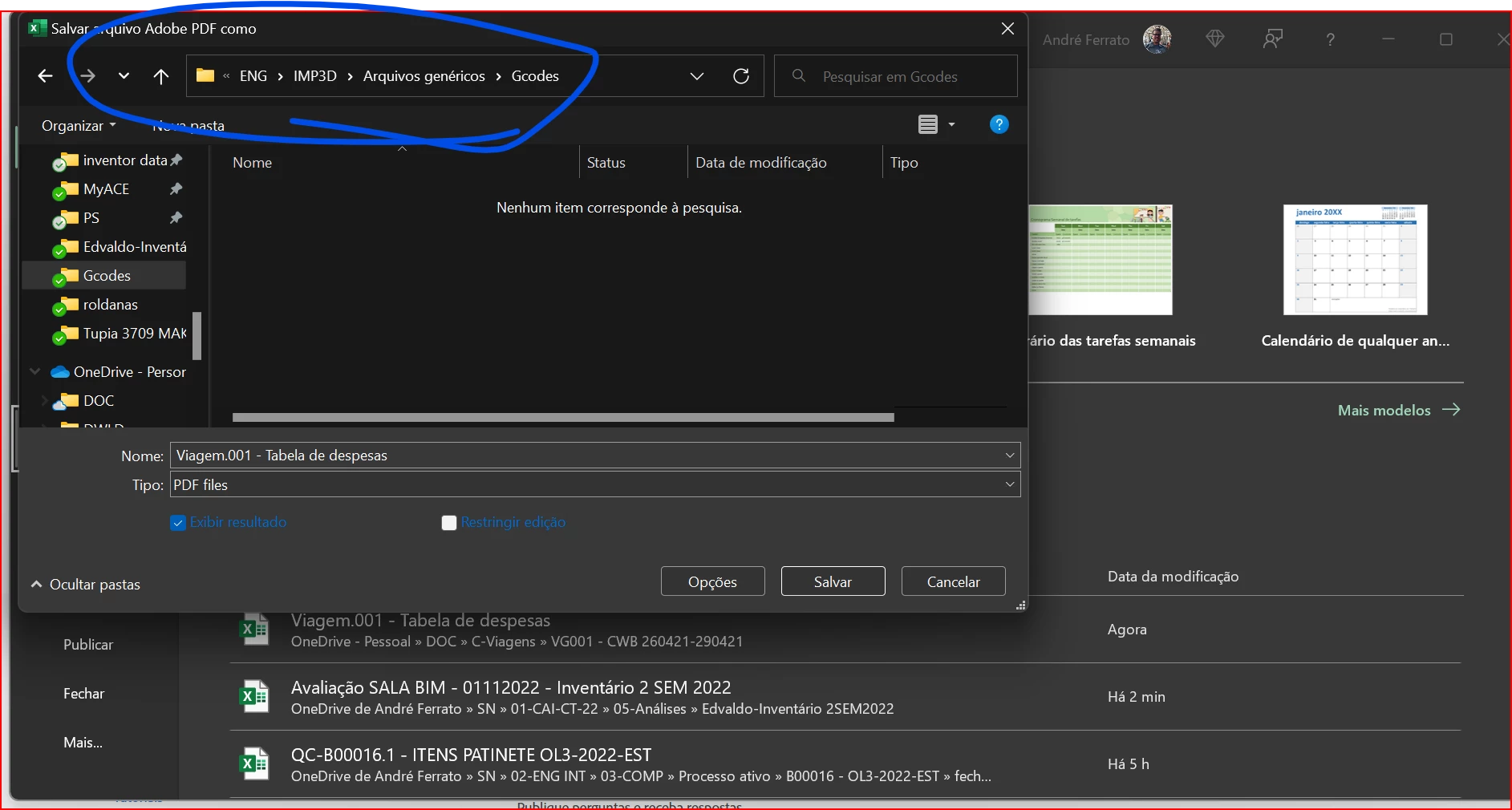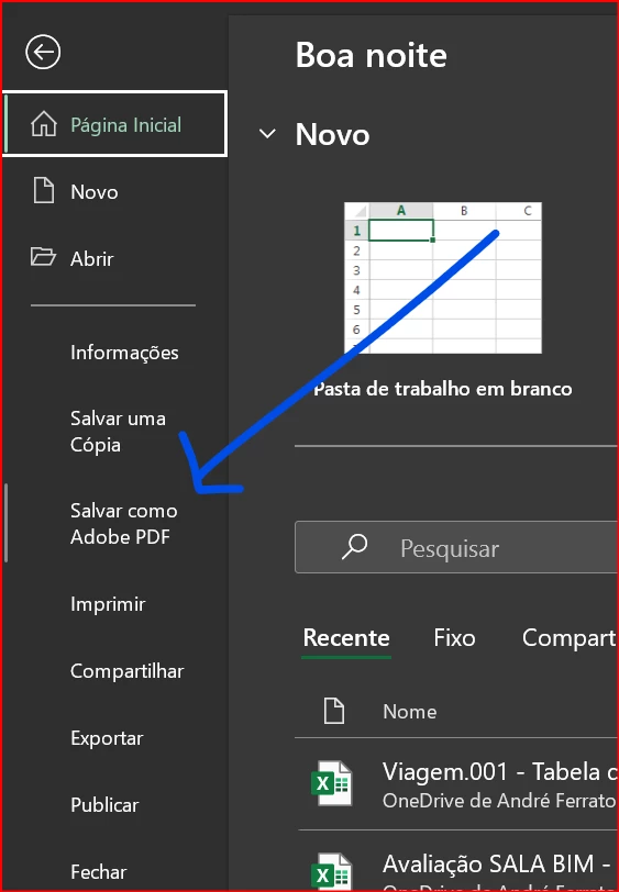 Ao pressionar o botão "Salvar como Adobe PDF" no Excel ou qualquer botão relacionado no menu do Windows. Conforme imagem abaixo.