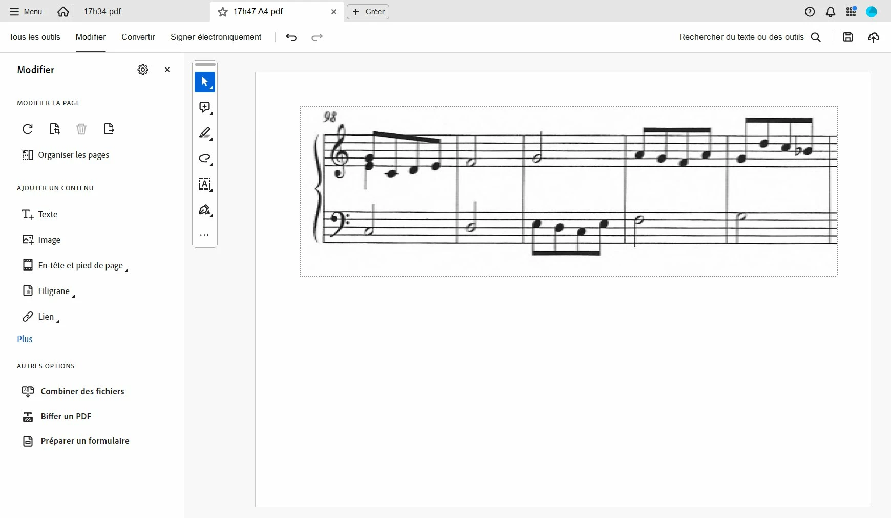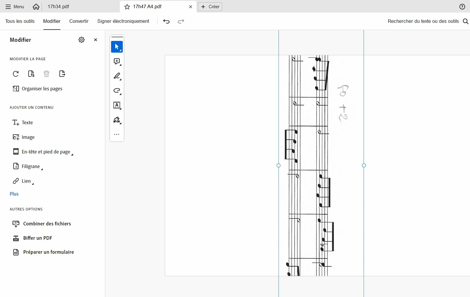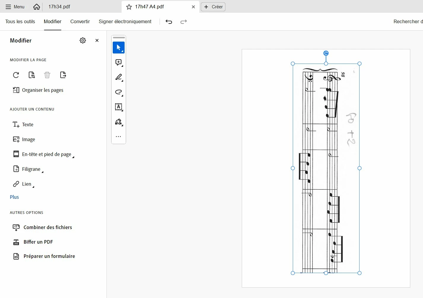 Now, if I go back to the score and change the page rotation from landscape to portrait and do the same (selection of a part of the score + copy) :