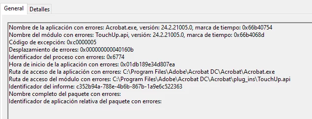 Ruta de acceso del módulo con errores: C:\Program Files\Adobe\Acrobat DC\Acrobat\plug_ins\TouchUp.api