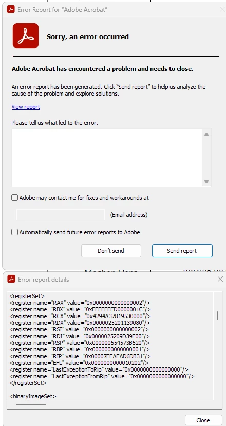 The error code it gives me when I click "View Report" is long and Adobe won't let me post it here for some reason. Please view here: https://drive.google.com/file/d/1ENnMwEyvl2IA_xyrj9Vt__6FlDPVLm7N/view?usp=sharing