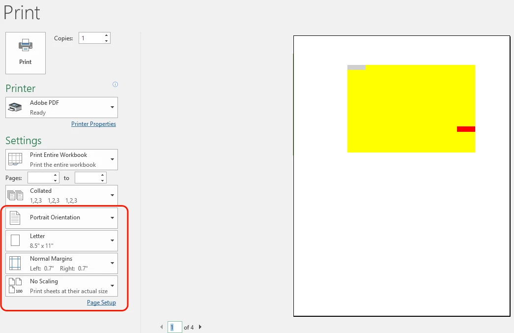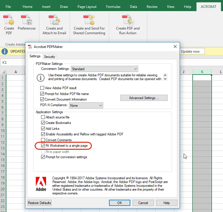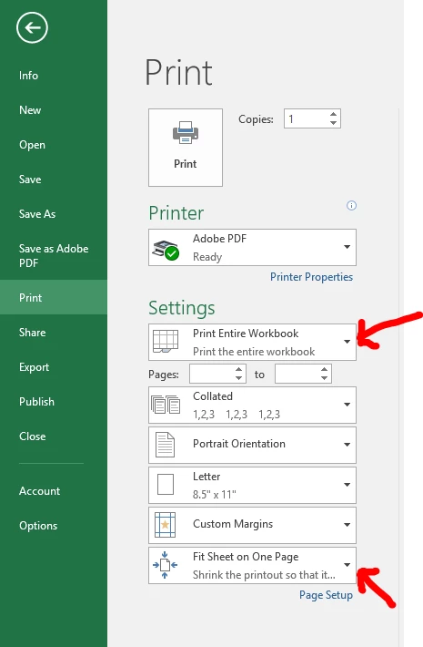 My office recently applied an update to Acrobat XI Pro (we now are on 11.0.23). Prior to the update, in both Excel 2013 and 2016, when we printed to "Adobe PDF" the entire workbook (all tabs or multiple selected tabs), it would put all of the output into one PDF file. Now it is splitting them up by what appears to be page size. What do I do to change it so that the output is all in one PDF file?