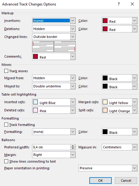 Markup is added by activating Track Changes, then in advanced options the following is selected:
