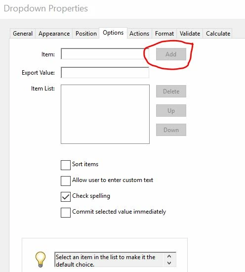 Creating a blank default option in a drop down form field in Acrobat Pro.