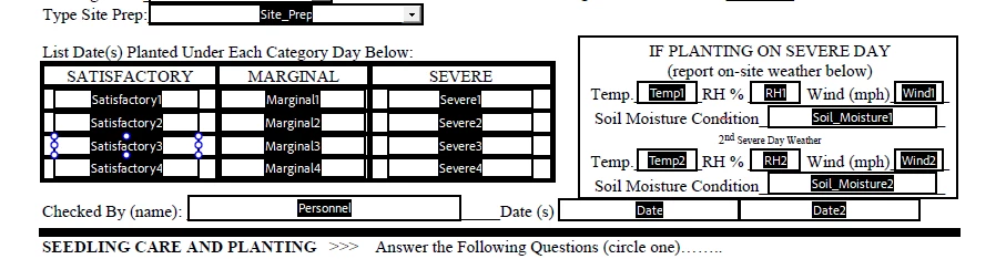 I have an existing (tree planting) form that I am making fillable. The Satisfactory, Marginal, and Severe fields are all ‘date’ fields. If a date is placed in the “Severe” column, I need it to require the completion of the Temp, RH, Wind and Soil_Moisture1/2 in the “If Planting On A Severe Day” column.