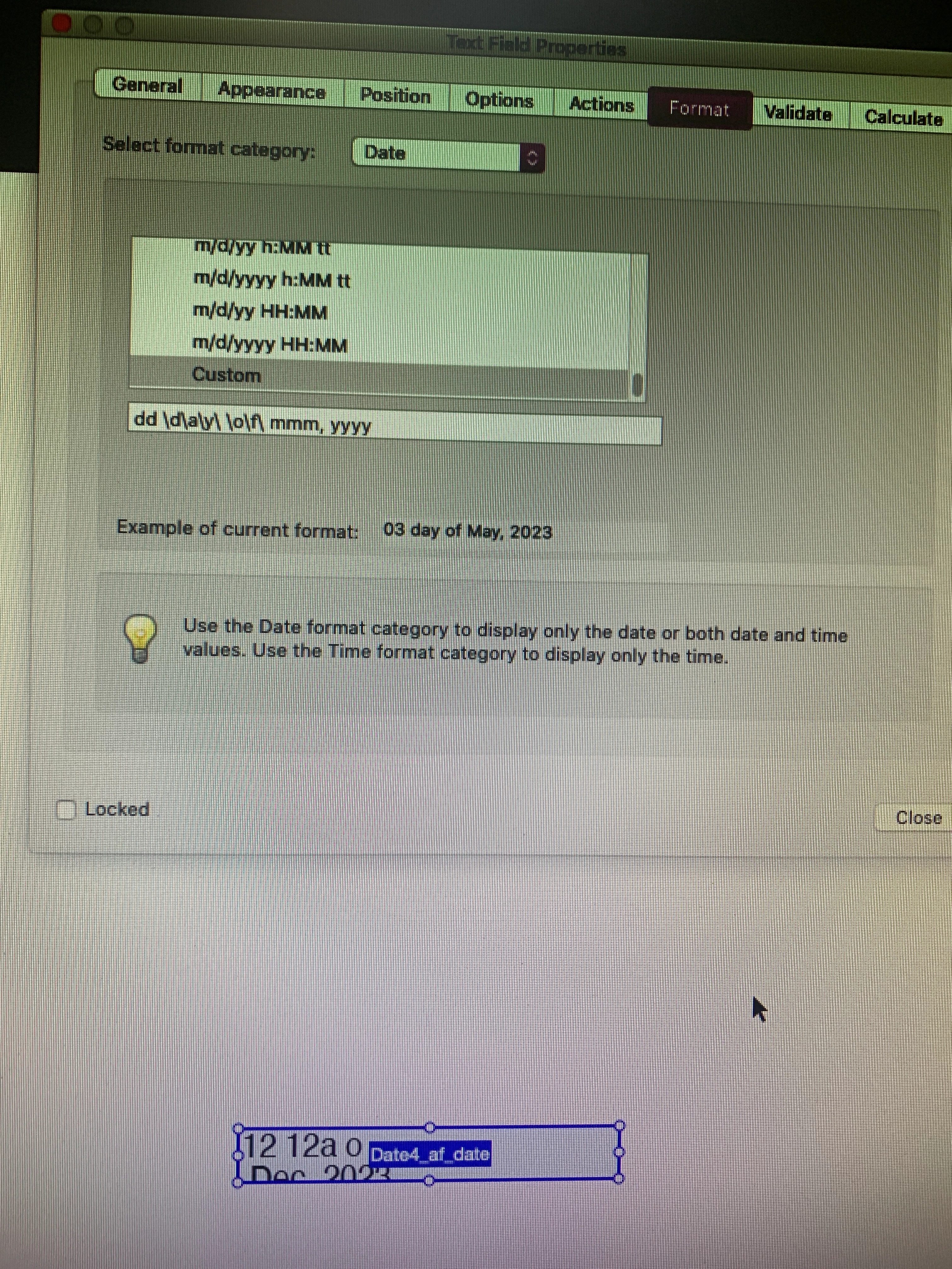 I thought I had the custom format working because the example and when I select a date from the date picker it shows correctly, however when I then click off the form box it screws up. I've attached a photo to show what I mean.