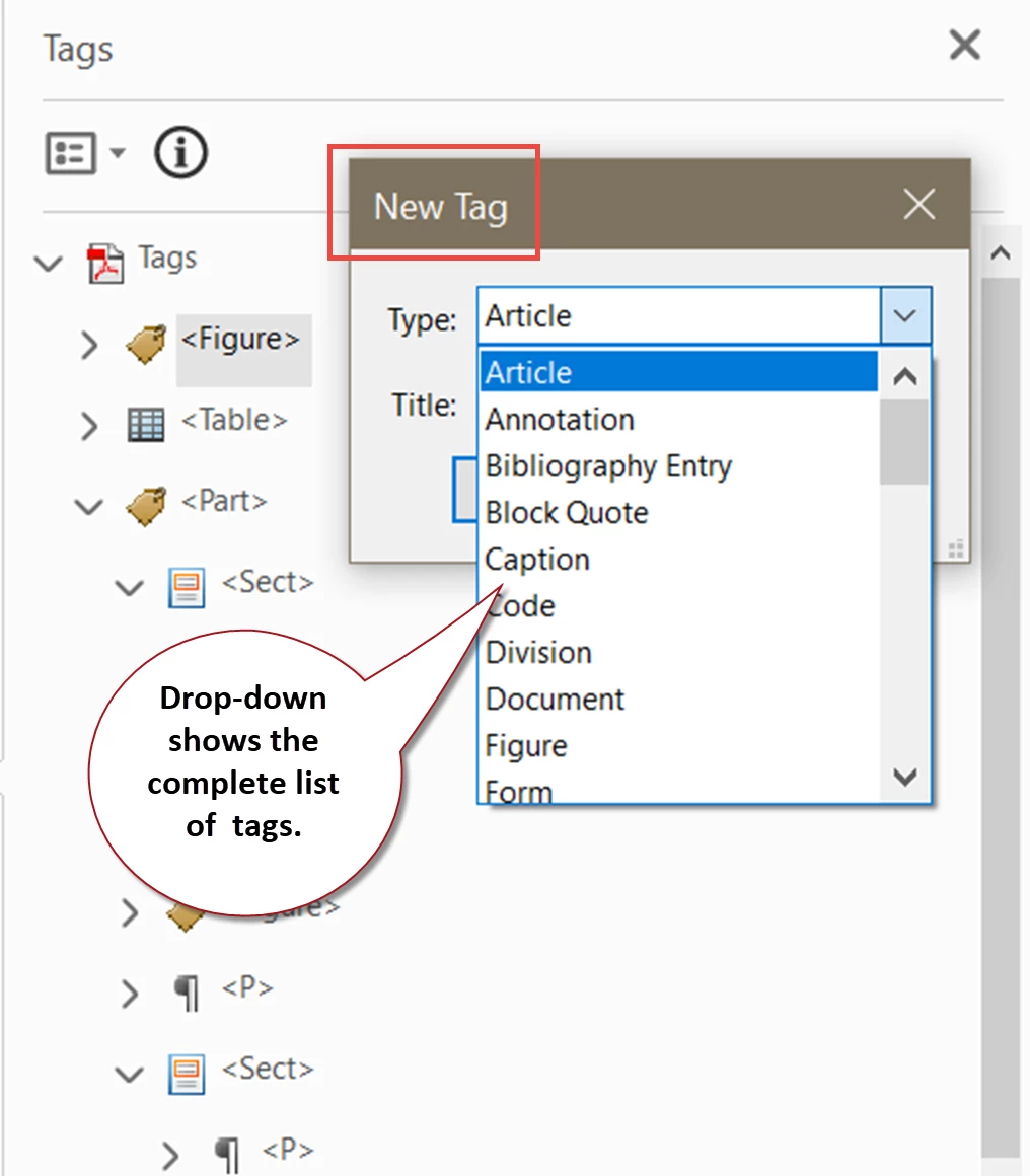 DC Pro and Tags (Accessible PDF): New tag pop up does not show all tags...