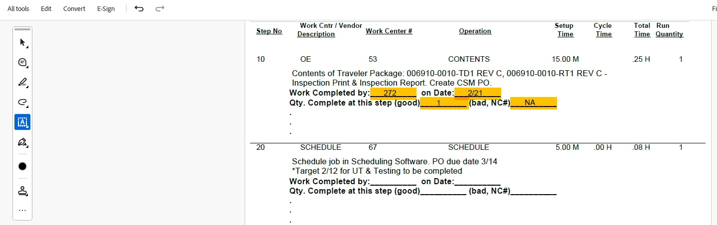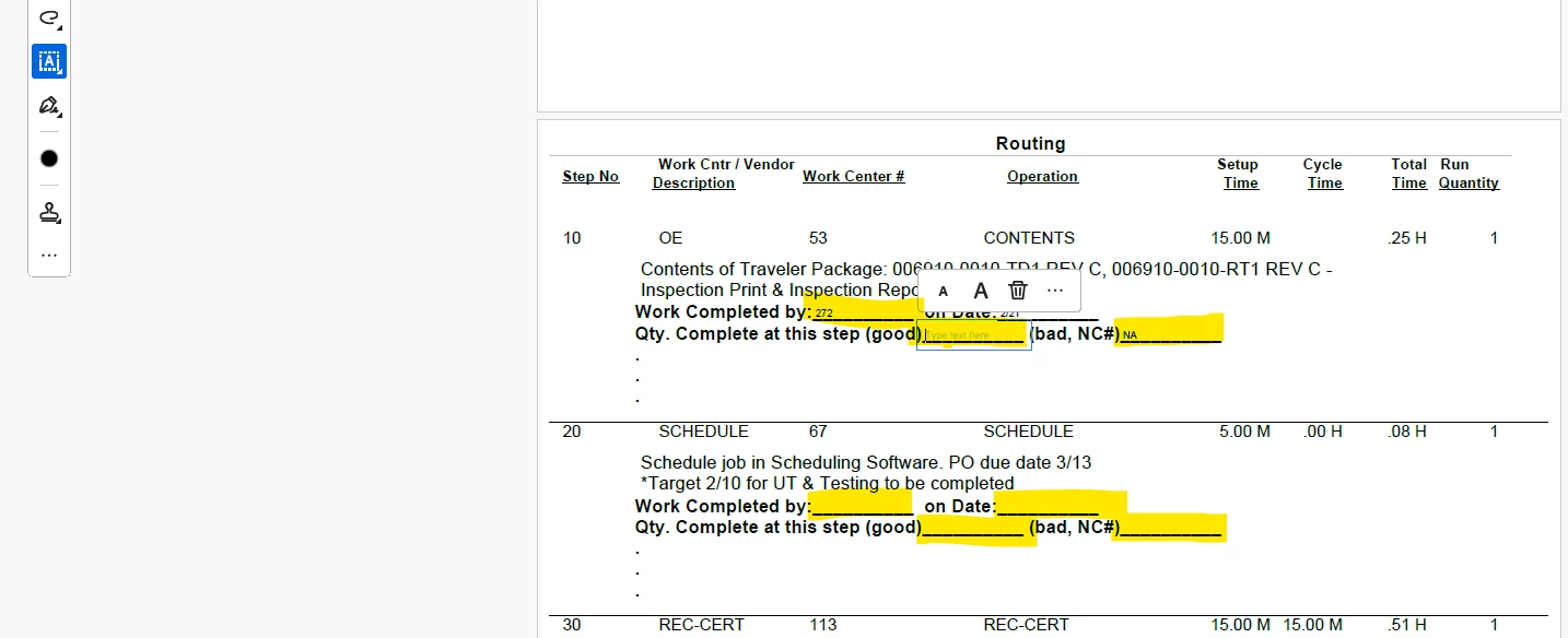 Hello. We use our main ERP system to create "routings" that needs text added after being saved. We select print "save as PDF" an save the PDF'on our C drive in Solidworks PDM. Then we open the Solid Works PDF and find the location where I saved the PDF. I need to to add text to my PDF, but I do not want to create a "form" or edit any of the other text on the PDF. As the attached pictures show, the font is very small and on the far left of the line. How do I make the default font bigger without hitting the "A" several times depending how big I want the text and how do I get it centered on the line as default? Also, is there a way to auto fill the 'work completed by' line based on current user signed in and auto fill the date?