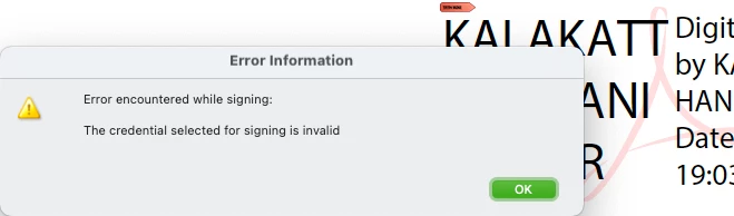 Signing with Digital Certificate doesn't work; and it always give me: [the Credential selected for signing is invalid]... attached file.