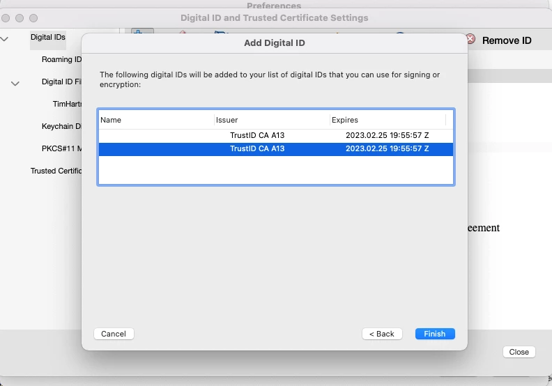I have an IdenTrust digital certificate saved on my device and have used it to sign PDFs in the past, but now when I sign it only shows the date stamp of when I signed, no name next to it. When I click on the signature and view details it does show my email address and that the certificate is valid, but will not show when just viewing the document. I have tried to View>Show/Hide>Signatures
