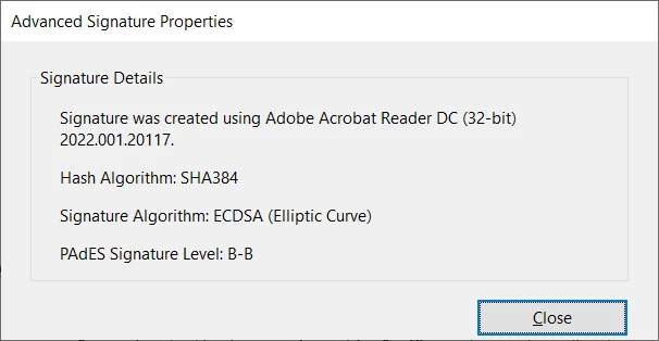 Adobe Reader and Acrobat have problems with creation of PAdES digital signature when I use a TEST certificate that has RSA 2K private kay, and this certificate was issued by TEST CA (not on EU trusted list, but this is not the issue) that signed this certificate with sha384ECDSA.