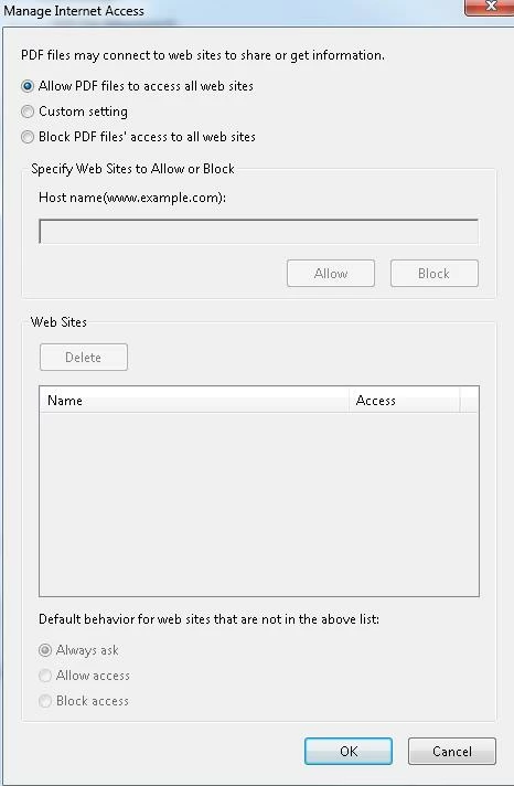 internet access from pdf files > change settings > click "allow access" under default behavior for web sites ....