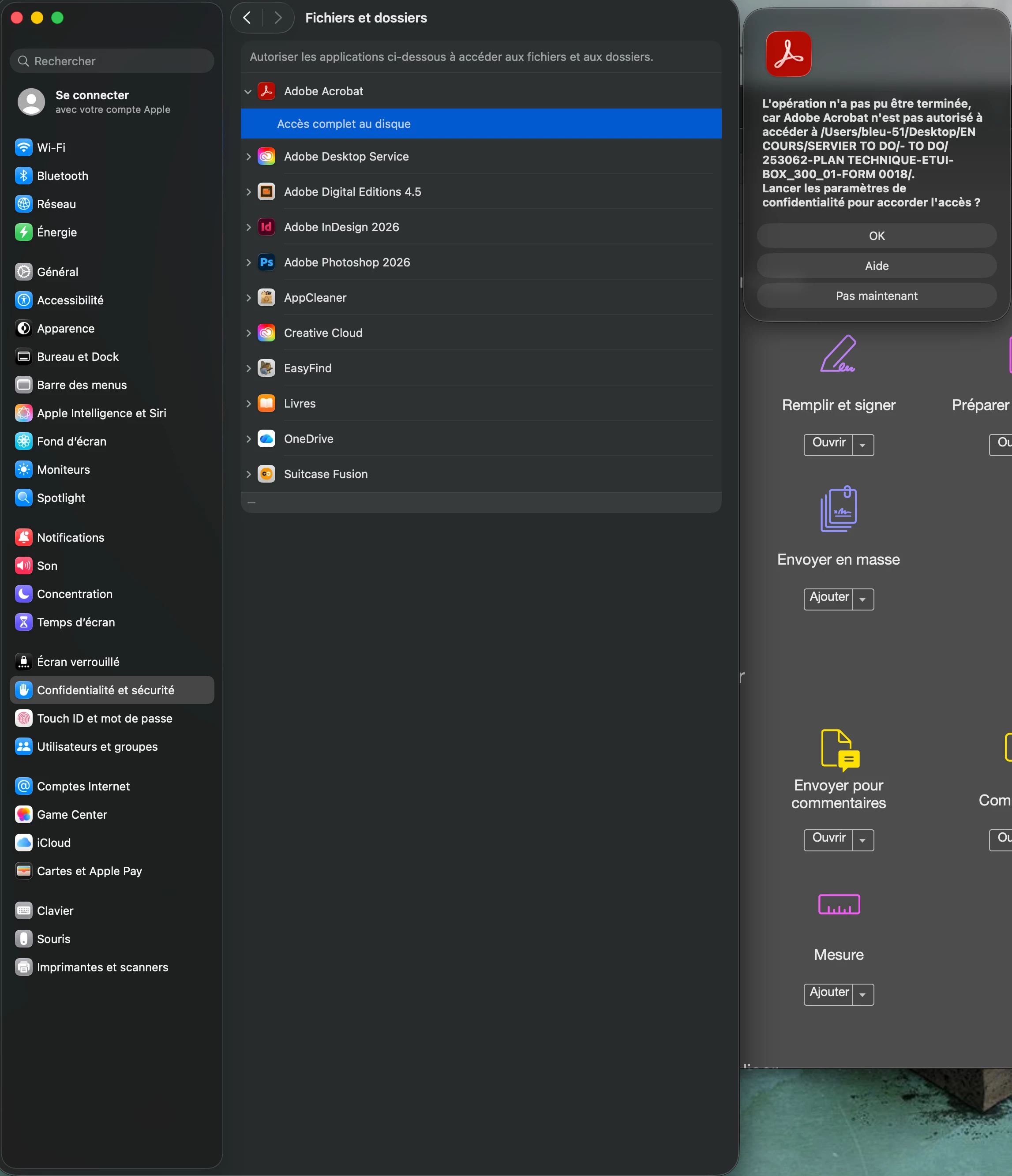 Adobe Acrobat inform me that it can't write on disk instead of right settings in privacy setting (Full disk acces).