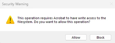 This message is triggered not directly by Acrobat, but by the JavaScript code being executed within it, especially when that script tries to access the file system (e.g., saving files, reading paths, or modifying locations outside trusted folders). Acrobat, acting cautiously, prompts the user for explicit permission.