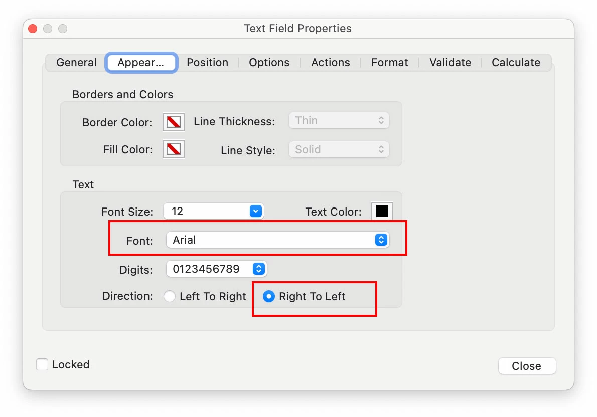Another step for Arabic form is that you need to change all the Arabic fillable fields to have the "Right To Left" settings and apply a font that has Arabic glyphs such as Arial or Times.