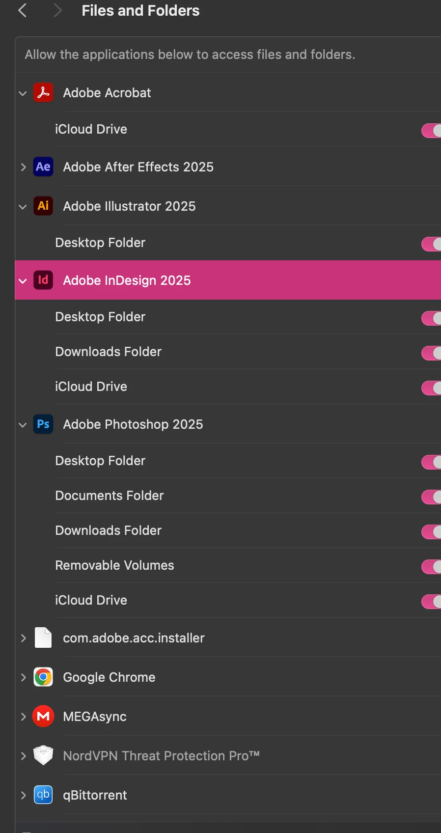 When I go into privacy settings, "Downloads" doesn't even show up as an option for me to grant permission for. The only option is iCloud. Where did the other options go? My only workaround so far has been to drop all of my downloads into my iCloud folder, but this is really inconvenient. It's weird that the same thing seems to be the case for Illustrator as well with only "Desktop" as an option.