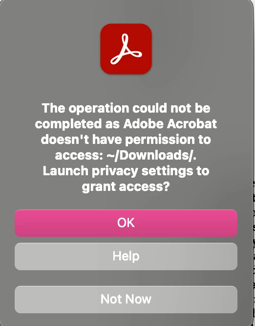 The operation could not be completed as Adobe Acrobat doesn't have permission to access: ~/Downloads/.