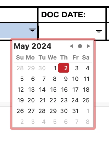 Select Exit Preview > File > Save > Adobe Cloud Storage > Home > Your Files > Check box to select file > Download > Location = "Desktop" (Running MacOS Sonoma 14.4.1) > Double-click to open the PDF > Click in the "DOC DATE:" field > box turns blue and cursor appears > no drop-down arrow and no calendar (see snapshot) > Can type in date only (see snapshot):
